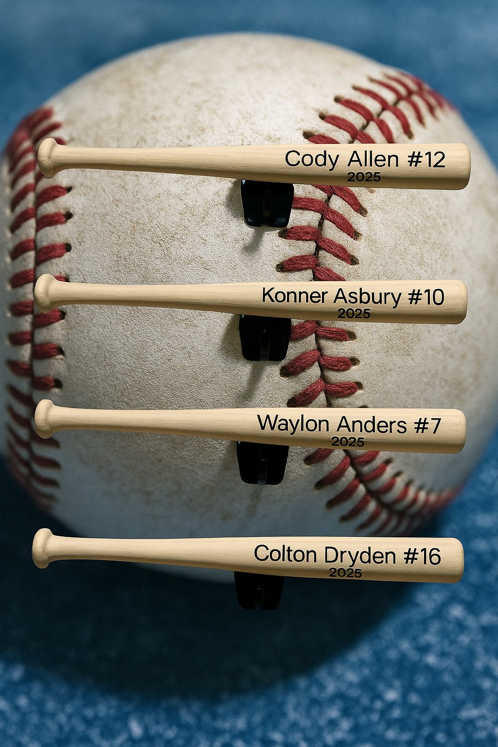 Baseball bats measure 18 inches in length. Personalize each bat with name, number, and year.